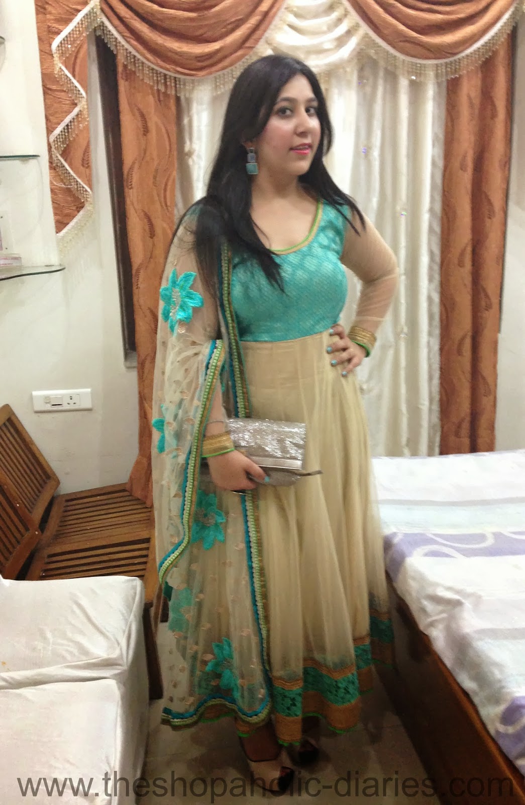 Up next was the selection of accessories - as the suit had an embroidered dupatta and full sleeves in net, I decided to pair it up only with matching danglers and my search ended at Juvalia & You with these Seashore earrings studded with Aqua and blue stones. Juvalia & You offers amazing international styles in fashion jewellery and also offers Indian women a career alternative.